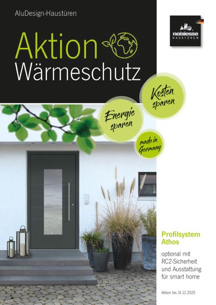 Zur Grundausstattung der Aktionstüren von Noblesse gehört neben einer mechanischen Dreifachverriegelung, eine vierseitig umlaufende Anschlagdichtung sowie zwei Bolzensicherungen für Ihre Sicherheit. Außerdem bieten die Dreifachverglasung, das verbaute Wärmeschutzglas sowie die Dämmzone mit zusätzlicher wärmegedämmter Flachbodenschwelle die optimale Dämmfunktion für Ihr Haus. Mehr Infos finden Sie im Katalog.
